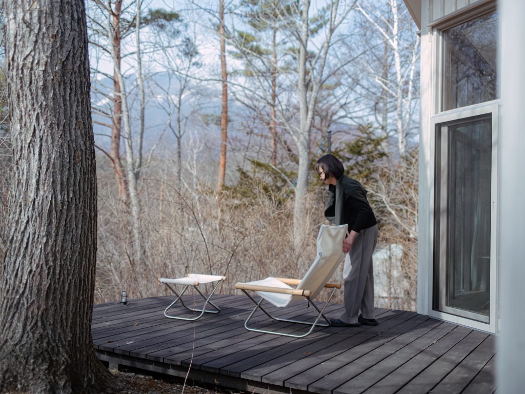 『白の家』では、リビングに座って読書をしたり、テラスのデッキに持ち出して、外の風景を眺めたり、くつろぎの時間を楽しんでいる。福岡さんの東京の自宅では、ニーチェアエックスが彼女の日課である瞑想の場所になっているのだそう。