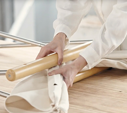 最後に、一度ニーチェアエックスを開いてシートがしっかり張られた状態にし、もう一度ネジを堅く締めることで美しく仕上がります。