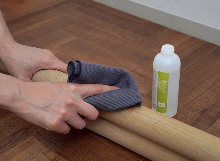 ソープフィニッシュの肘かけは、時間の経過と共に、表面のコーティングがなくなっていきます。定期的にメンテナンスすることで、汚れをつきにくくし、乾燥によるひび割れを防ぐことができます。以下の手順でお手入れしてください。